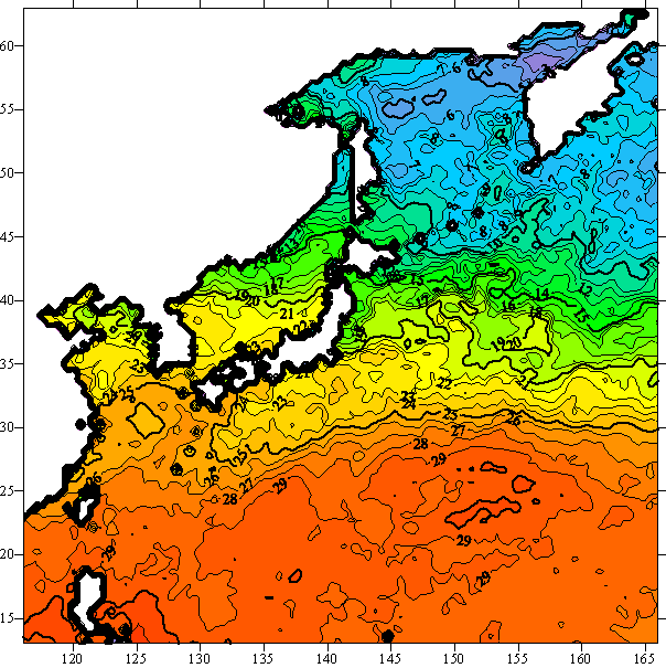 o 2005년 06월 24일 북서태평양 광역해양 수온분포 입니다.