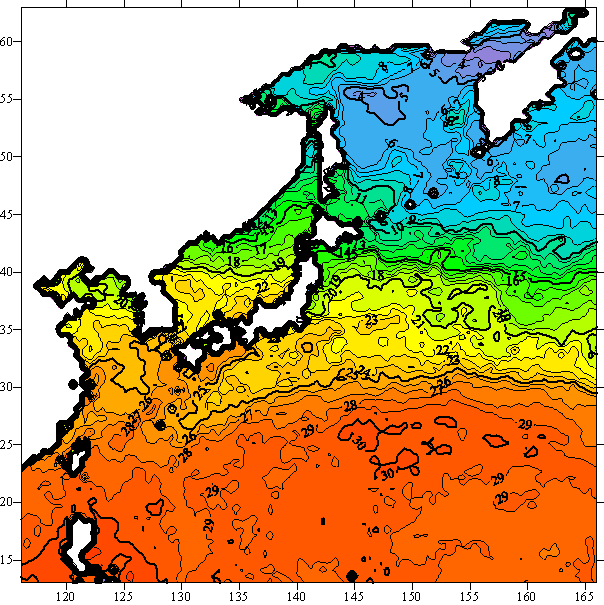o 2005년 06월 25일 북서태평양 광역해양 수온분포 입니다.