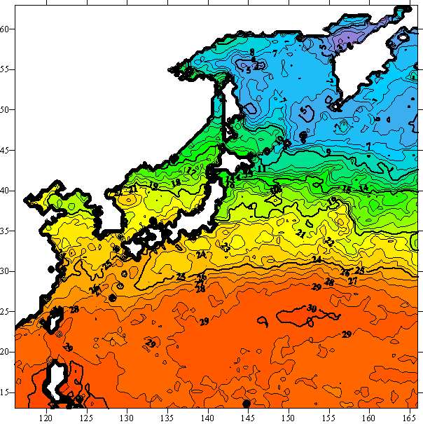 o 2005년 06월 26일 북서태평양 광역해양 수온분포 입니다.