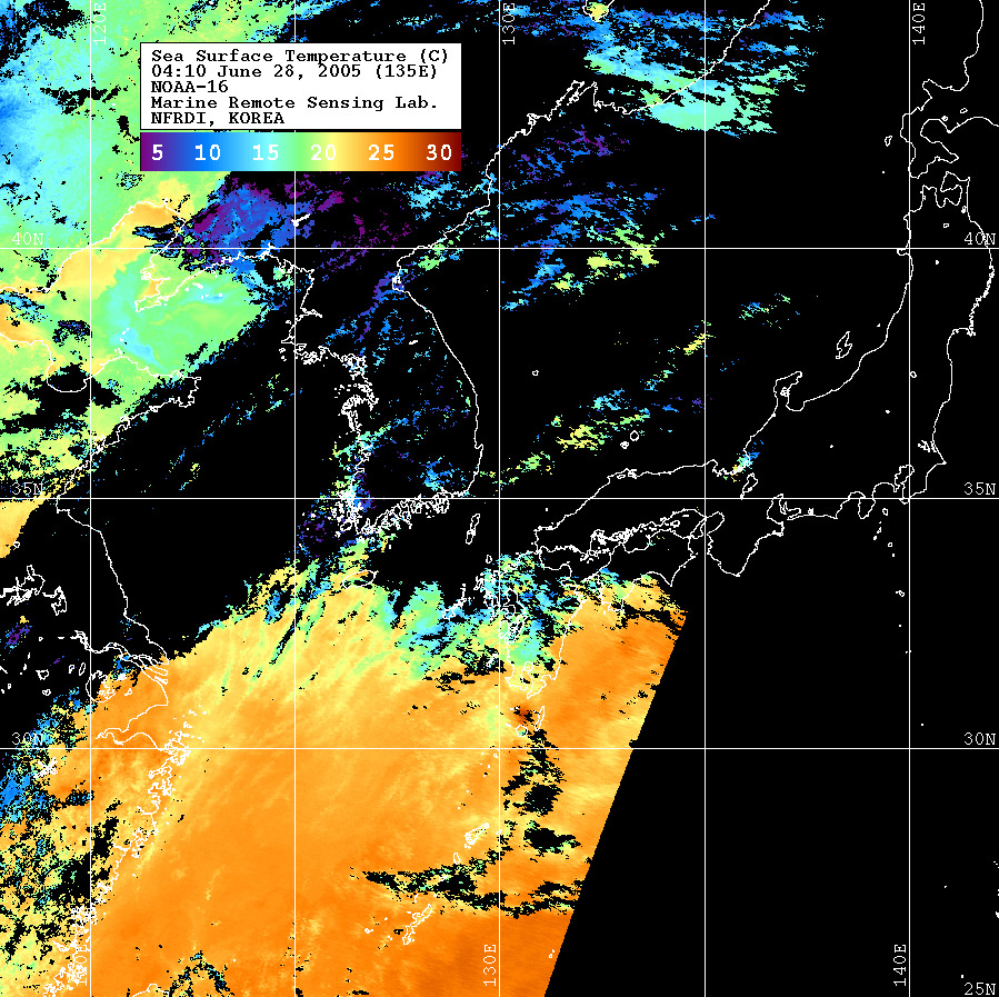 o 2005년 06월 28일 04시 10분 NOAA-16호 위성영상입니다. o 수온분포는 범례를 참고하시기 바랍니다. o 검은색은 구름 또는 육지를 나타냅니다.