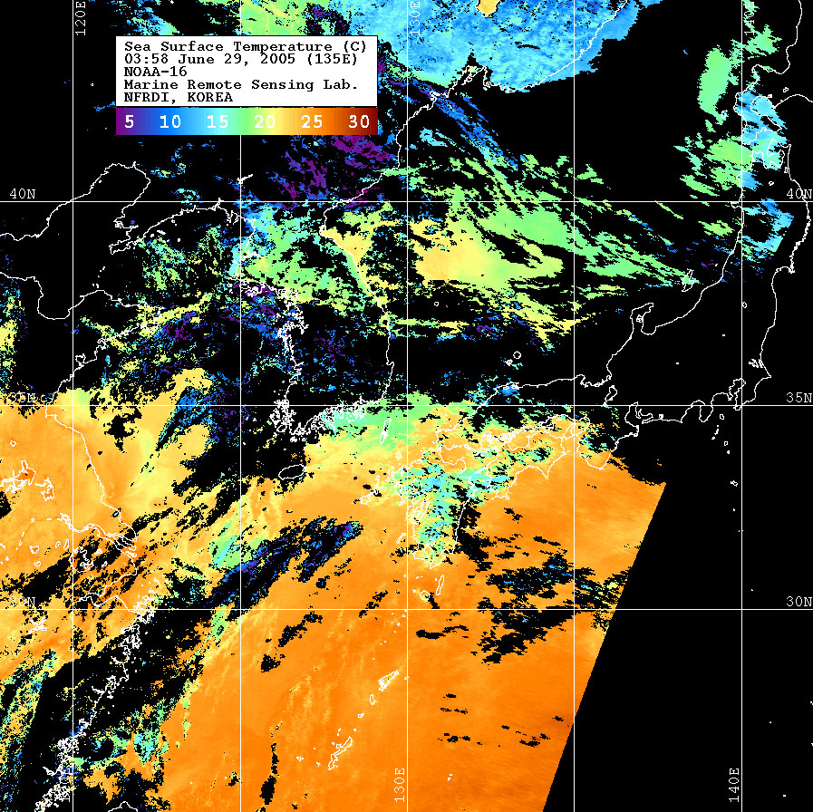 o 2005년 06월 29일 03시 58분 NOAA-16호 위성영상입니다. o 수온분포는 범례를 참고하시기 바랍니다. o 검은색은 구름 또는 육지를 나타냅니다.