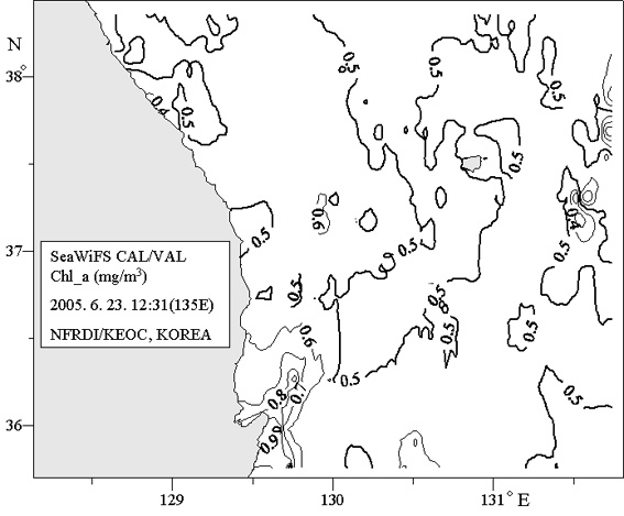 o 아래 그림은 2005년 6월 23일 위성추정 기초먹이생물량 분포도입니다.