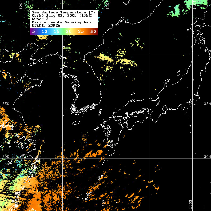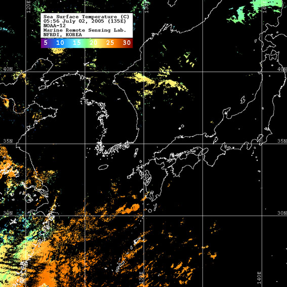 o 2005년 07월 02일 05시 56분 NOAA-12호 위성영상입니다. o 수온분포는 범례를 참고하시기 바랍니다. o 검은색은 구름 또는 육지를 나타냅니다.