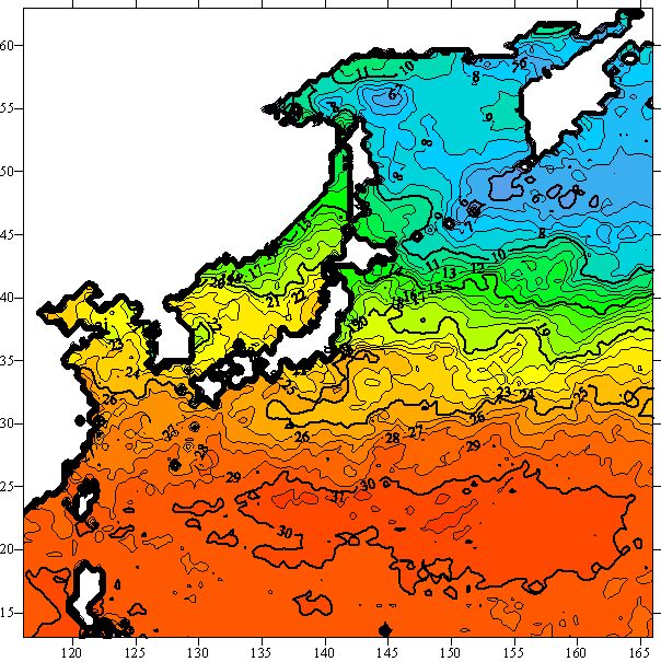 o 2005년 07월 03일 북서태평양 광역해양 수온분포 입니다.