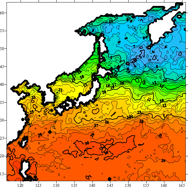 o 2005년 07월 04일 북서태평양 광역해양 수온분포 입니다.