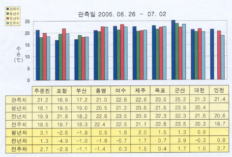 o 금주(2005.06.26∼07.02)의 한반도 연안 표면수온은 동해 연안역에서 섭씨 16∼22도, 남해 연안역에서 17∼23도, 서해 연안역에서 21∼25도 내외로 나타납니다.