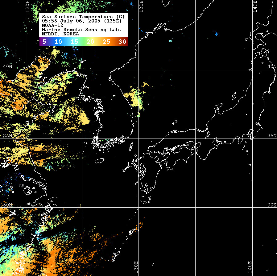 o 2005년 07월 06일 05시 58분 NOAA-12호 위성영상입니다. o 수온분포는 범례를 참고하시기 바랍니다. o 검은색은 구름 또는 육지를 나타냅니다.