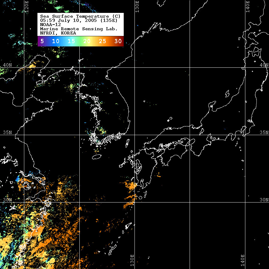 o 2005년 07월 10일 05시 59분 NOAA-12호 위성영상입니다. o 수온분포는 범례를 참고하시기 바랍니다. o 검은색은 구름 또는 육지를 나타냅니다.