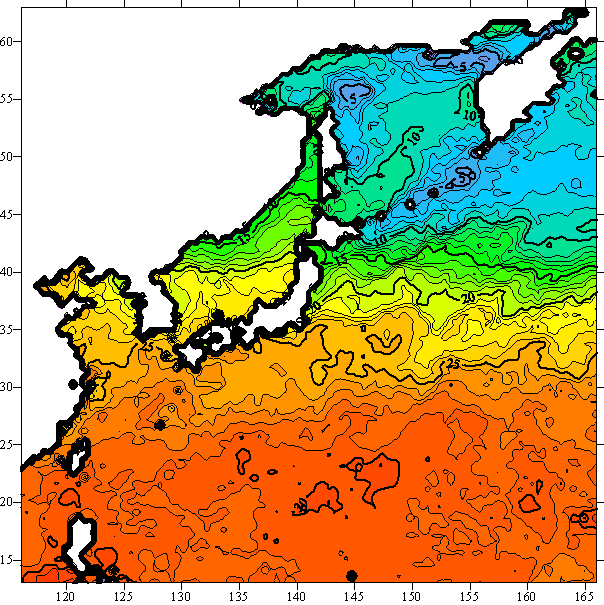 o 2005년 07월 09일 북서태평양 광역해양 수온분포 입니다.