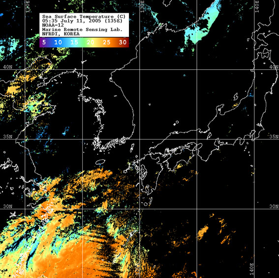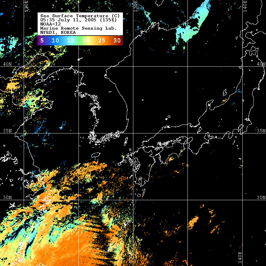 o 2005년 07월 11일 05시 35분 NOAA-12호 위성영상입니다. o 수온분포는 범례를 참고하시기 바랍니다. o 검은색은 구름 또는 육지를 나타냅니다.