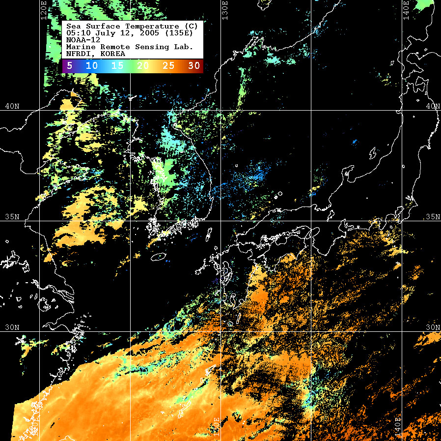 o 2005년 07월 12일 05시 10분 NOAA-12호 위성영상입니다. o 수온분포는 범례를 참고하시기 바랍니다. o 검은색은 구름 또는 육지를 나타냅니다.