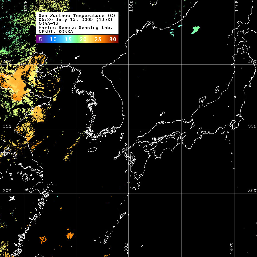 o 2005년 07월 13일 06시 26분 NOAA-12호 위성영상입니다. o 수온분포는 범례를 참고하시기 바랍니다. o 검은색은 구름 또는 육지를 나타냅니다.