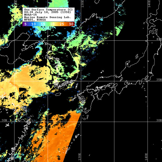 o 2005년 07월 14일 04시 28분 NOAA-16호 위성영상입니다. o 수온분포는 범례를 참고하시기 바랍니다. o 검은색은 구름 또는 육지를 나타냅니다.
