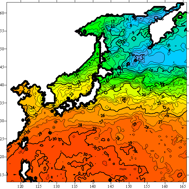 o 2005년 07월 13일 북서태평양 광역해양 수온분포 입니다.