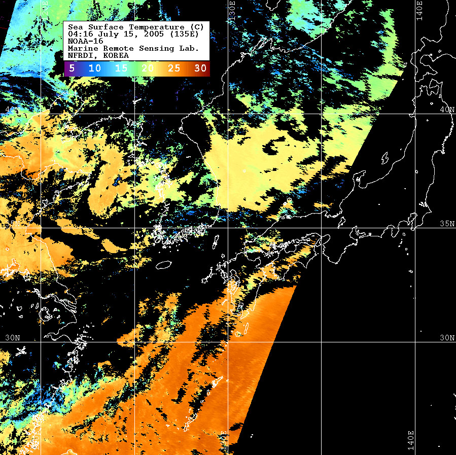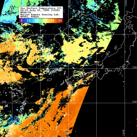 o 2005년 07월 15일 04시 16분 NOAA-16호 위성영상입니다. o 수온분포는 범례를 참고하시기 바랍니다. o 검은색은 구름 또는 육지를 나타냅니다.