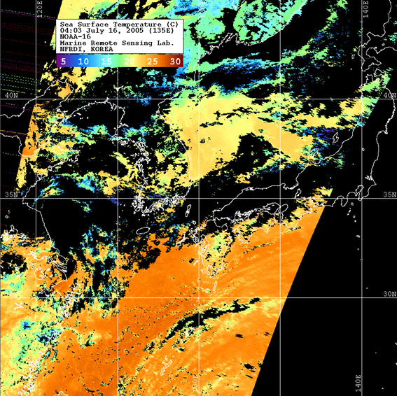 o 2005년 07월 16일 04시 03분 NOAA-16호 위성영상입니다. o 수온분포는 범례를 참고하시기 바랍니다. o 검은색은 구름 또는 육지를 나타냅니다.