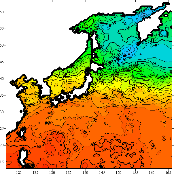 o 2005년 07월 16일 북서태평양 광역해양 수온분포 입니다.