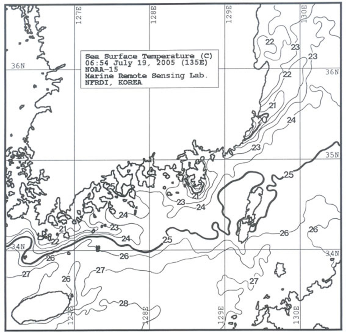 O 2005년 7월 19일 오전 7시 현재 NOAA위성 열감지기가 관측한 표면 수온분포도입니다. O 거제도 남쪽연안 및 기장∼울산연안에 섭씨 20도이하의 찬물이 나타나고 있습니다. O 고흥반도(외나로도) 주변수온이 상승하여 24도로 나타나고 있습니다.