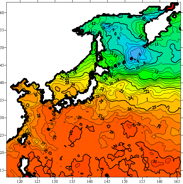 o 2005년 07월 21일 북서태평양 광역해양 수온분포 입니다.