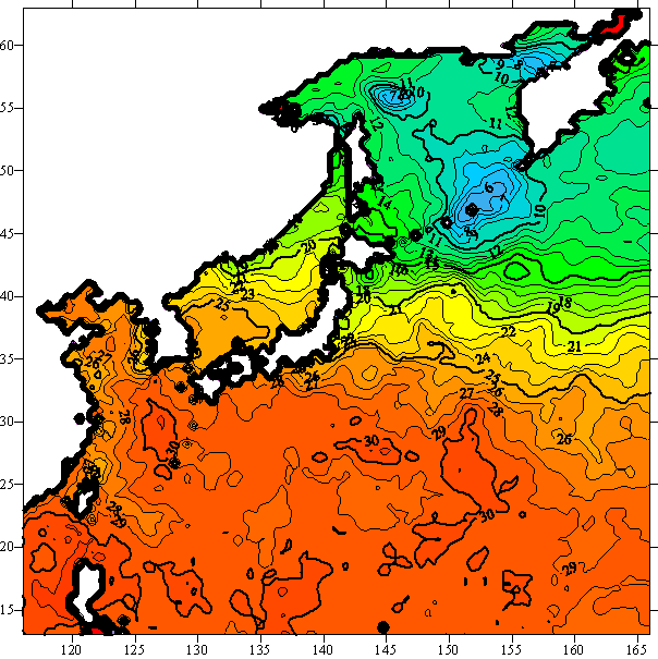 o 2005년 07월 23일 북서태평양 광역해양 수온분포 입니다.