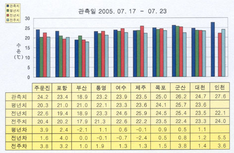 o 금주(2005.07.17∼07.23)의 한반도 연안 표면수온은 동해 연안역에서 섭씨 24∼26도, 남해 연안역에서 21∼24도, 서해 연안역에서 25∼28도 내외로 나타납니다.