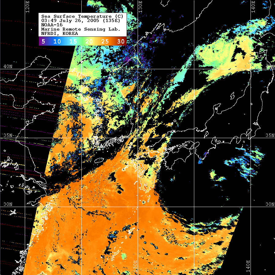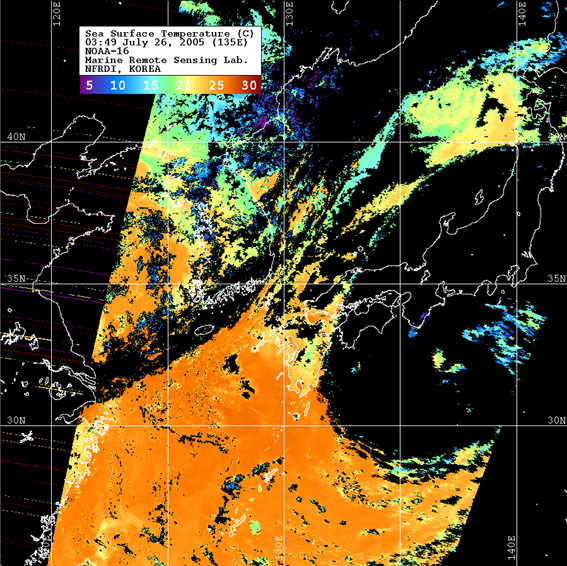 o 2005년 07월 26일 03시 49분 NOAA-16호 위성영상입니다. o 수온분포는 범례를 참고하시기 바랍니다. o 검은색은 구름 또는 육지를 나타냅니다.
