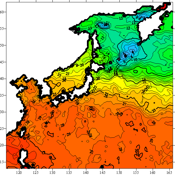 o 2005년 07월 25일 북서태평양 광역해양 수온분포 입니다.