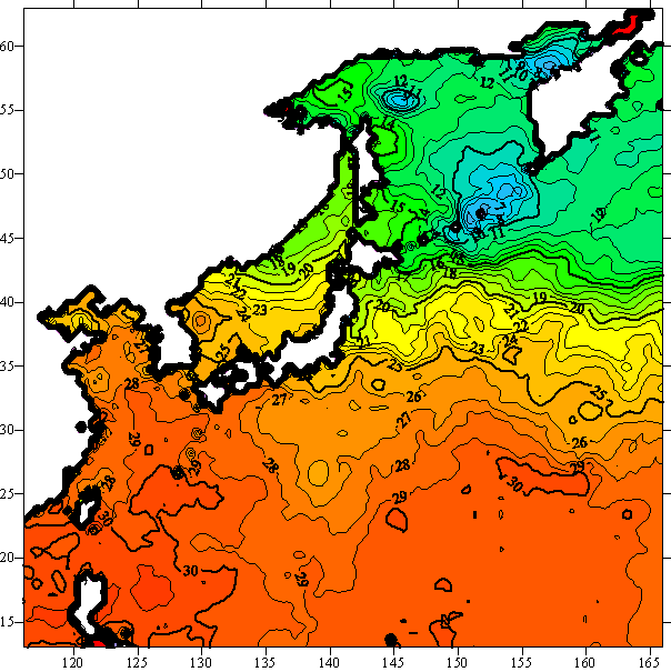 o 2005년 07월 27일 북서태평양 광역해양 수온분포 입니다.