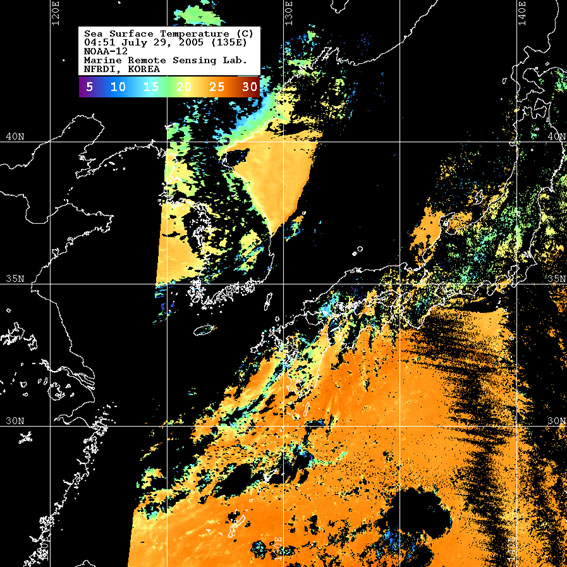 o 2005년 07월 28일 04시 51분 NOAA-12호 위성영상입니다. o 수온분포는 범례를 참고하시기 바랍니다. o 검은색은 구름 또는 육지를 나타냅니다.