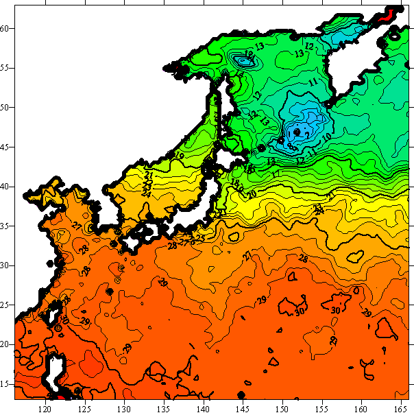 o 2005년 07월 28일 북서태평양 광역해양 수온분포 입니다.