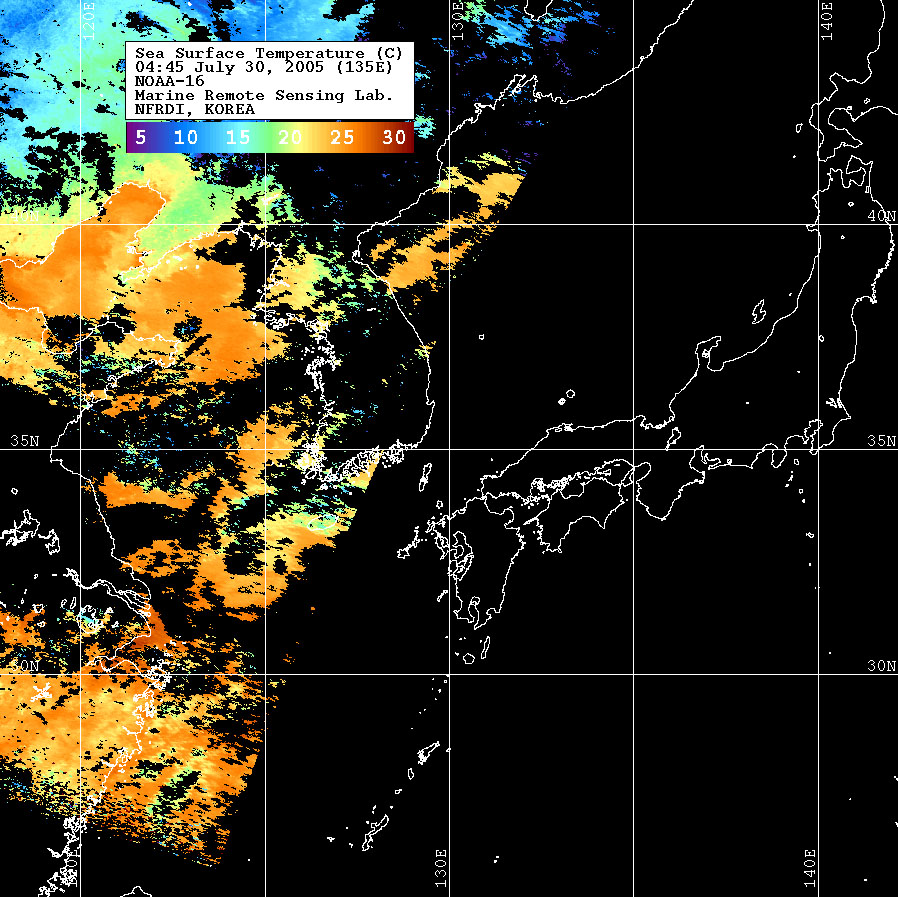 o 2005년 07월 30일 04시 45분 NOAA-16호 위성영상입니다. o 수온분포는 범례를 참고하시기 바랍니다. o 검은색은 구름 또는 육지를 나타냅니다.