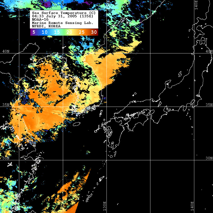 o 2005년 07월 31일 04시 33분 NOAA-16호 위성영상입니다. o 수온분포는 범례를 참고하시기 바랍니다. o 검은색은 구름 또는 육지를 나타냅니다.