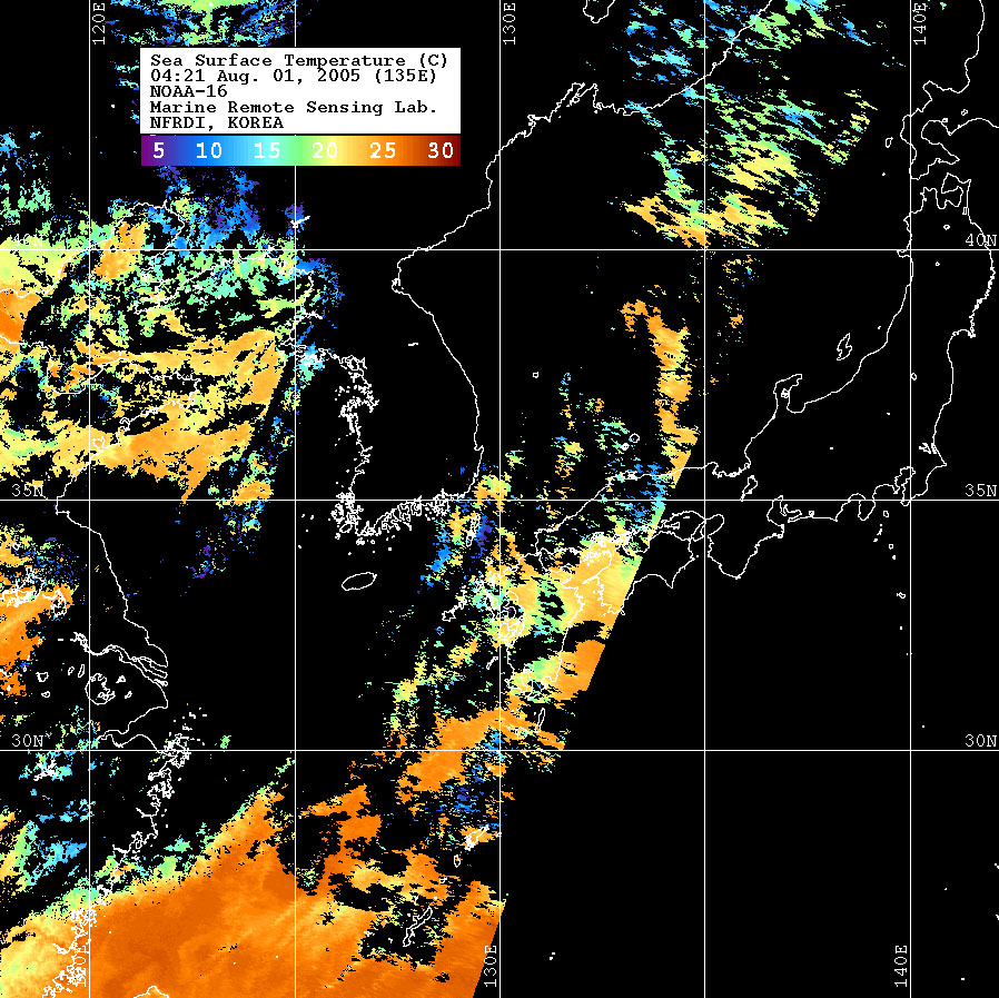 o 2005년 08월 01일 04시 21분 NOAA-16호 위성영상입니다. o 수온분포는 범례를 참고하시기 바랍니다. o 검은색은 구름 또는 육지를 나타냅니다.