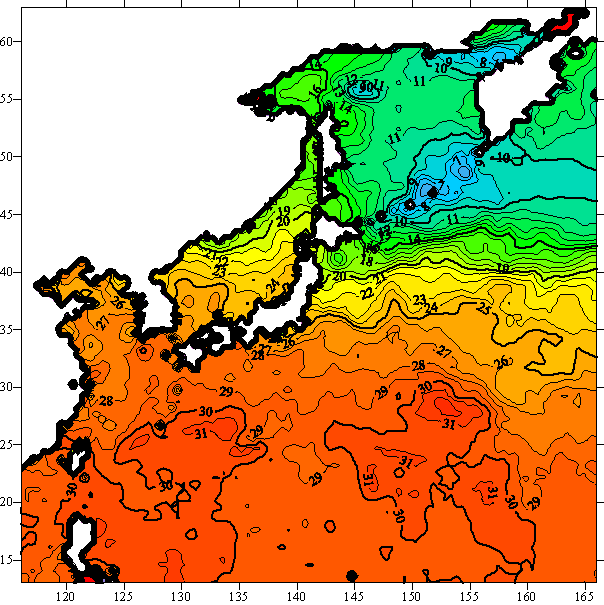 o 2005년 07월 31일 북서태평양 광역해양 수온분포 입니다.