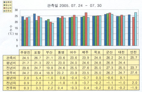 o 금주(2005.07.24∼07.30)의 한반도 연안 표면수온은 동해 연안역에서 섭씨 25∼27도, 남해 연안역에서 22∼25도, 서해 연안역에서 25∼27도 내외로 나타납니다.