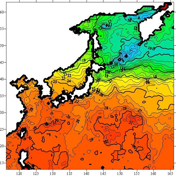 o 2005년 08월 01일 북서태평양 광역해양 수온분포 입니다.