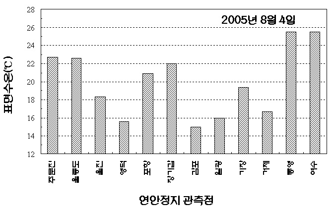 o 아래 그림은 2005년 8월 4일 오전 10시에 각 연안정지 관측점에서의 수온분포입니다.