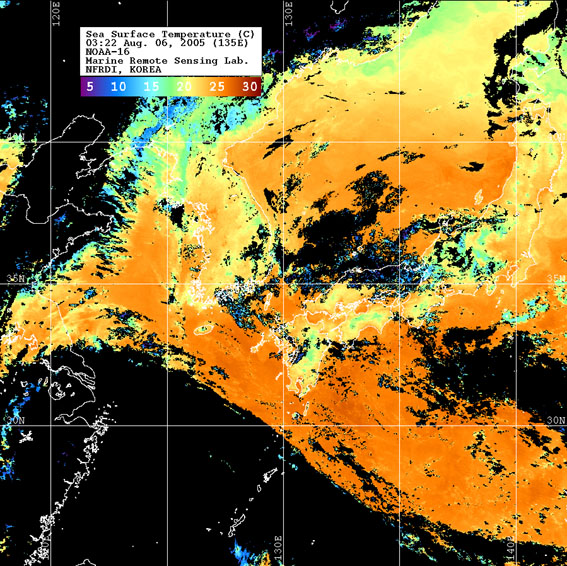 o 2005년 08월 06일 03시 22분 NOAA-16호 위성영상입니다. o 수온분포는 범례를 참고하시기 바랍니다. o 검은색은 구름 또는 육지를 나타냅니다.