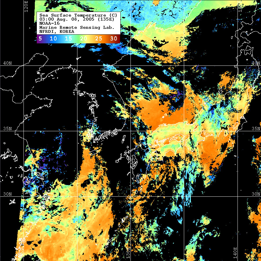 o 2005년 08월 08일 03시 00분 NOAA-16호 위성영상입니다. o 수온분포는 범례를 참고하시기 바랍니다. o 검은색은 구름 또는 육지를 나타냅니다.