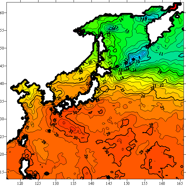 o 2005년 08월 11일 북서태평양 광역해양 수온분포 입니다.