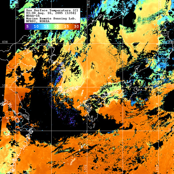 o 2005년 08월 16일 03시 08분 NOAA-16호 위성영상입니다. o 수온분포는 범례를 참고하시기 바랍니다. o 검은색은 구름 또는 육지를 나타냅니다.