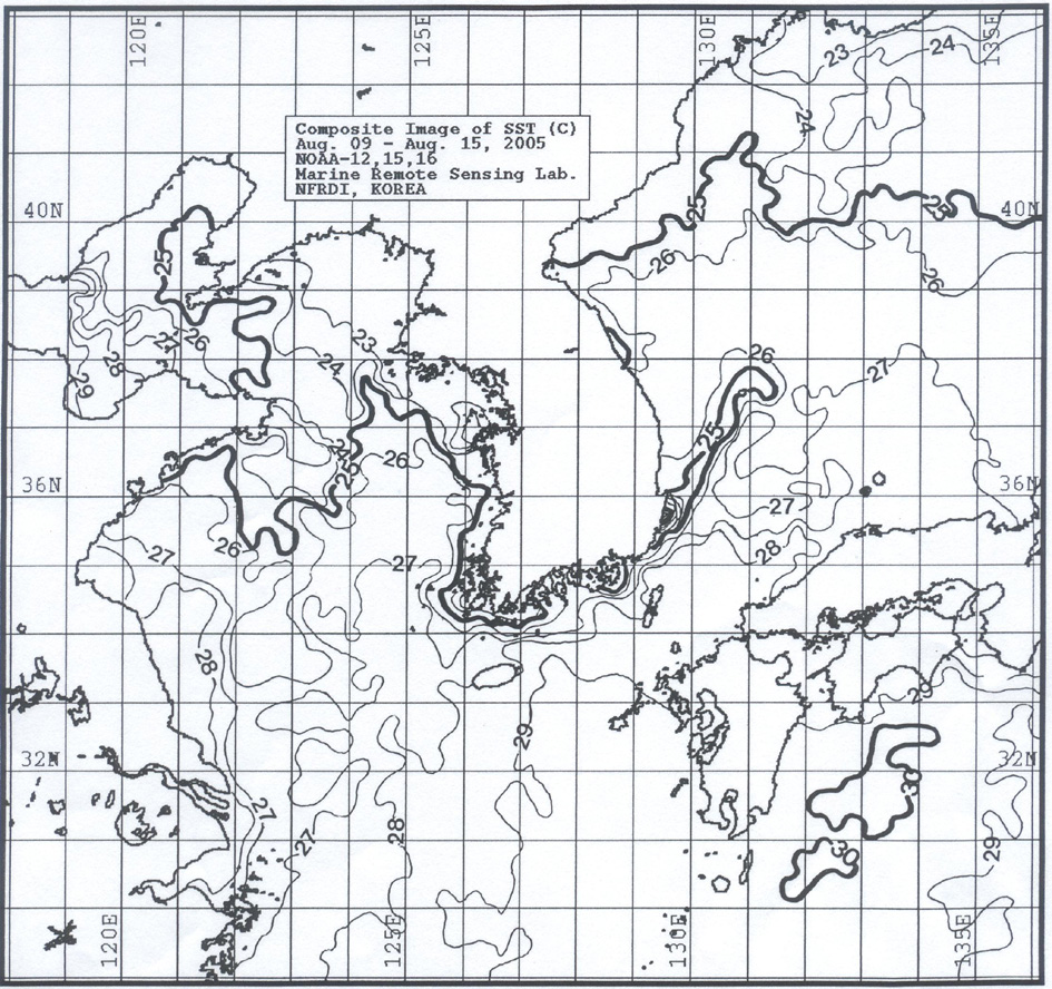 o 금주 (2005.08.09~08.15)의 한국근해 표면수온은 대화퇴 근해 섭씨 25~26도, 울릉도 근해 25~26도, 대마도 근해 28~29도, 제주도 근해 27~29도, 이어도 근해 28~29도, 일향초 근해 27~28도, 어청도 근해 25~27도 내외로 나타납니다.