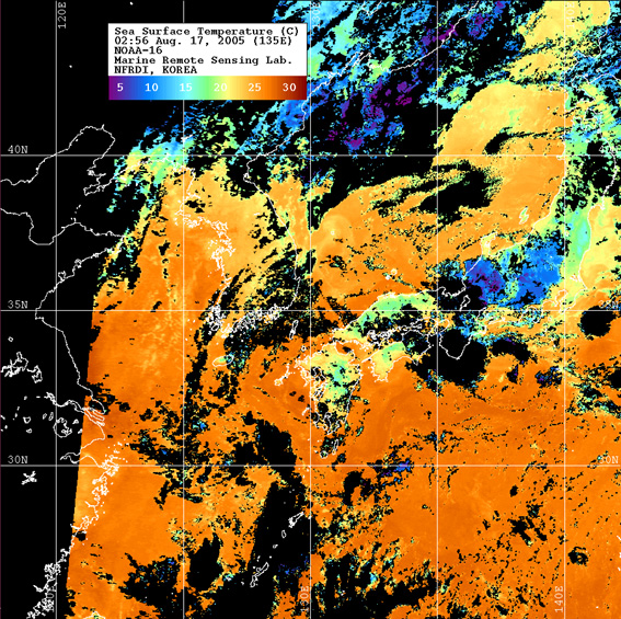 o 2005년 08월 17일 02시 56분 NOAA-16호 위성영상입니다. o 수온분포는 범례를 참고하시기 바랍니다. o 검은색은 구름 또는 육지를 나타냅니다.