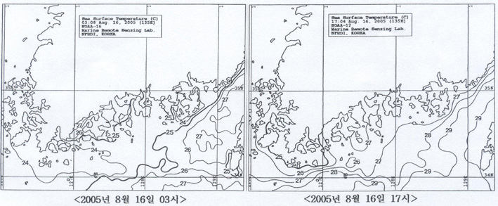 o 아래 그림은 2005년 8월 16일 오전 3시와 오후 5시에 인공위성으로 관측한 한국 남해의 표면수온분포입니다.