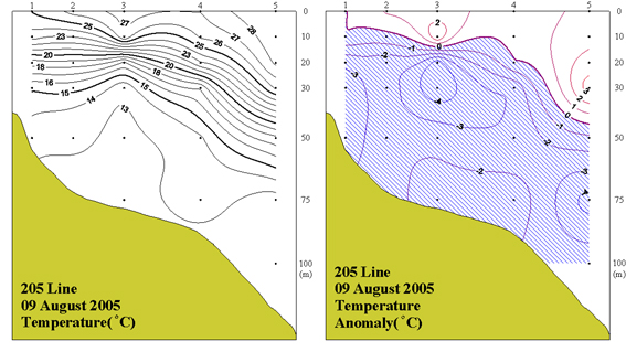 ◦ 2005년 8월 9일 국립수산과학원 남해수산연구소에서 조사한 205선(소리도 남동방)의 수직수온분포도 및 평년편차도 입니다.