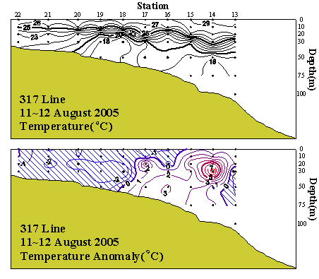 ◦ 2005년 8월 11~12일 국립수산과학원 해양연구팀에서 조사한 동중국해 북부해역(317선)의 수온 수직분포도와 평년편차도입니다.