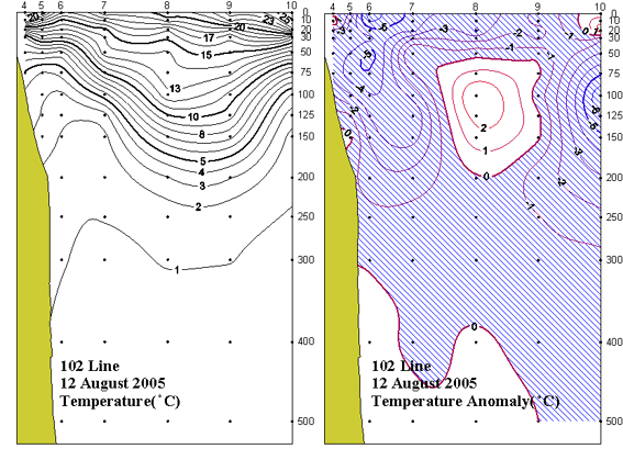 ◦ 2005년 8월 12일 국립수산과학원 동해수산연구소에서 조사한 102선(포항 동방)의 수직수온분포도 및 평년편차도 입니다.