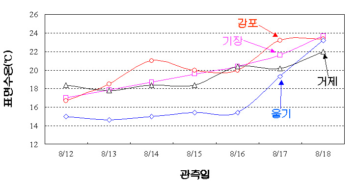 o 아래 그림은 2005년 8월 12일∼8월 18일까지 현장 관측한 기장-감포 연안의 일일 수온변동으로, 최근 수온이 주변해역과 비슷한 24∼25도를 보이고 있습니다.
