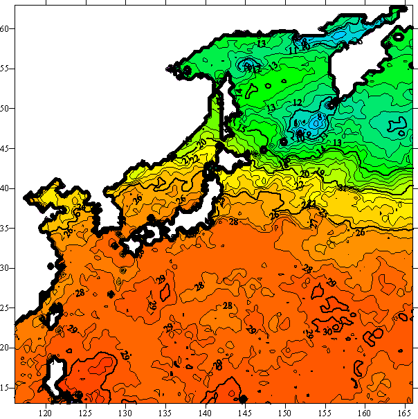 o 2005년 08월 21일 북서태평양 광역해양 수온분포 입니다.