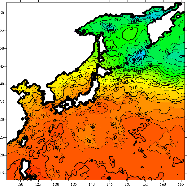 o 2005년 08월 24일 북서태평양 광역해양 수온분포 입니다.